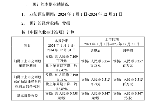 1月24日晚间,鞍钢股份有限公司(以下简称“鞍钢股份”或“公司”)发布2024年度业绩预告。公司预计2024年1-12月预计增亏,归属于上市公司股东的净利润为-71.09亿,净利润同比下降118.47%,预计基本每股收益为-0.7580元。